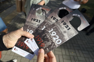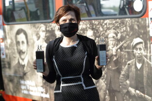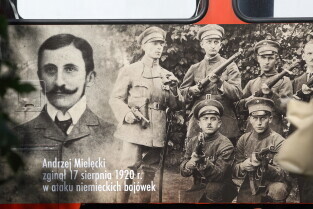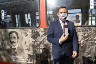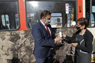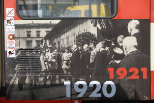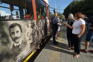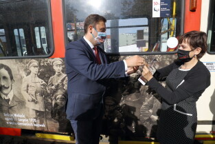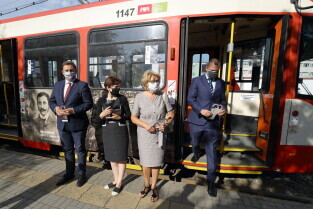 Gdańsk. Śląski tramwaj w Gdańsku, konferencja prasowa. W konferencji udział wzięli: Piotr Borawski, zastępca prezydenta ds. przedsiębiorczości i ochrony klimatu; Halina Bieda, dyrektor Muzeum Powstań Śląskich w Świętochłowicach oraz Danuta Gierdziejewska, zastępca prezesa Gdańskich Autobusów i Tramwajów.