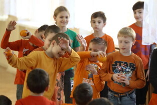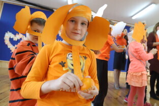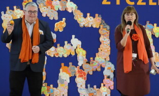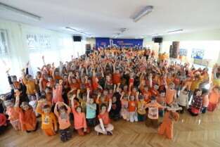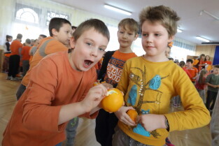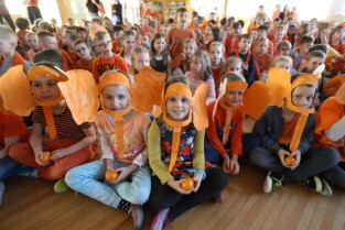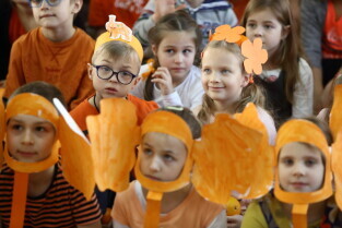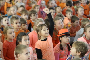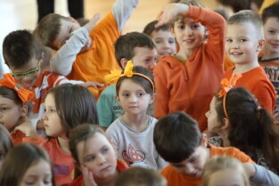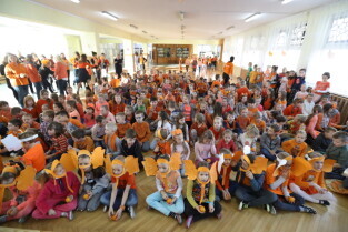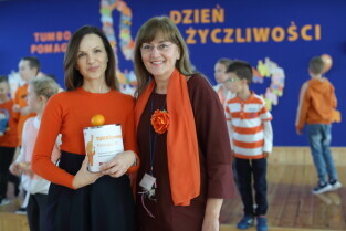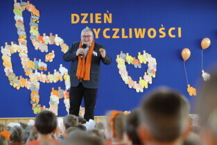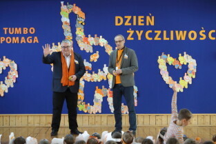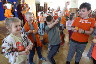 Gdańsk, Szkoła Podstawowa 48. Zajęcia z uczennicami i uczniami - nt. żałoby, zycia po stracie. W spotkaniu uczestniczył Piotr Kowalczuk zastępca prezydenta ds. polityki społecznej. W ten dzień w szkole królował kolor pomarańczowy i Słonik Tumbo.