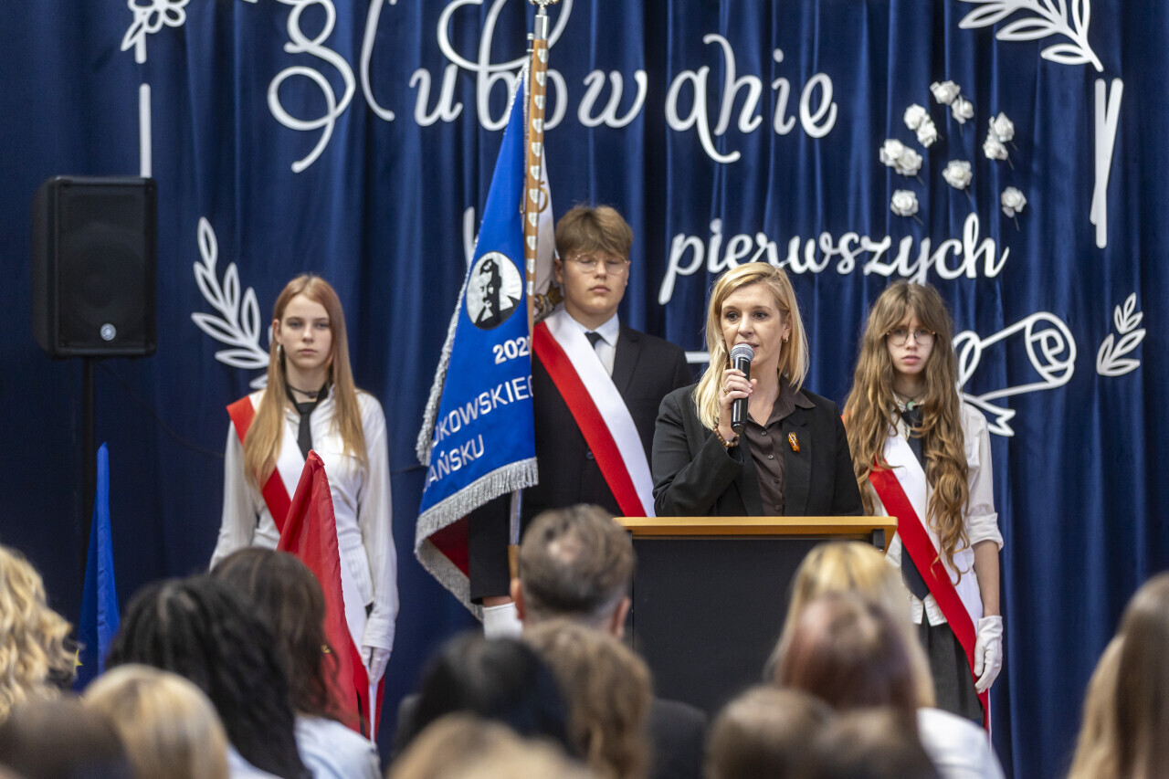 Gdańsk. Uroczyste ślubowanie pierwszych klas w X Liceum Ogólnokształcącym im. Lecha Bądkowskiego połączone z odsłonięciem muralu dydykowanego patronowi szkoły. W uroczystościach udział wzięli między innymi Emilia Lodzińska, Zastępczyni Prezydenta Miasta Gdańska ds. rozwoju przestrzennego i mieszkalnictwa, radni Andrzej Kowalczys i Wojciech Błaszkowski oraz Ryszard Muszytowski, Dyrektor Wydziału Edukacji w gdańskim magistracie. Gościem specjalnym była córka Lecha Bądkowskiego, Sławina Bądkowska-Kosmulska.