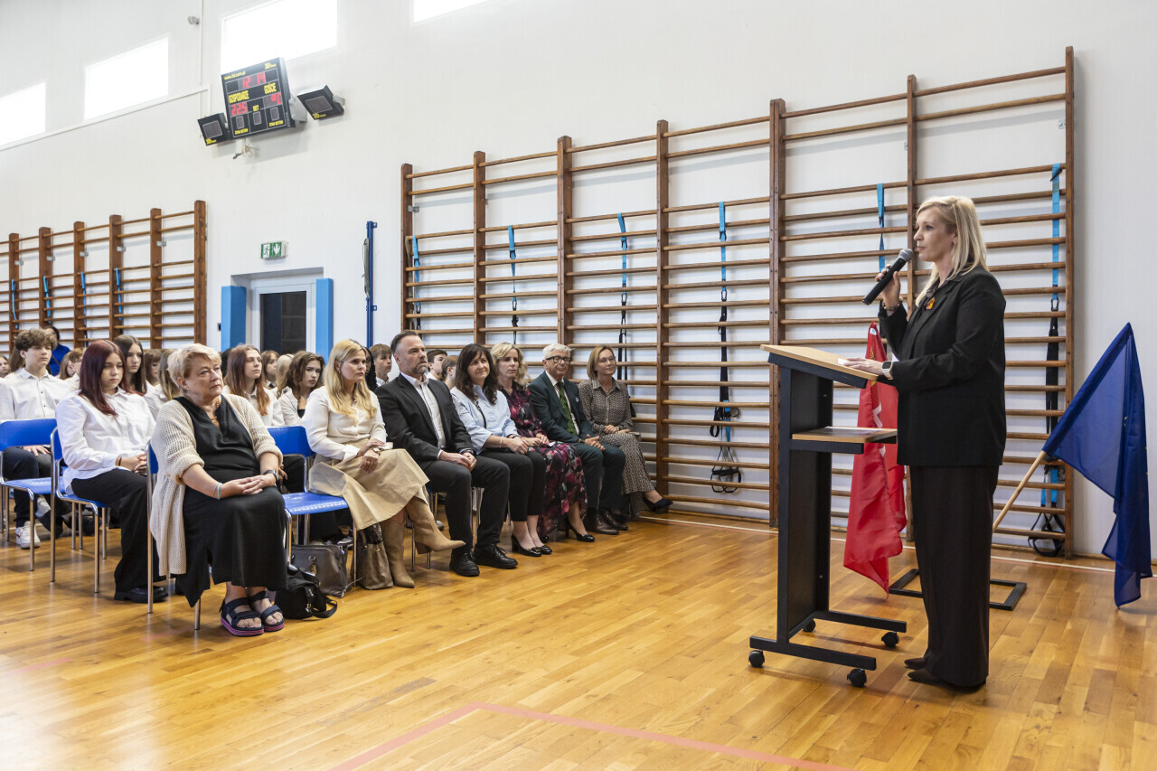 Gdańsk. Uroczyste ślubowanie pierwszych klas w X Liceum Ogólnokształcącym im. Lecha Bądkowskiego połączone z odsłonięciem muralu dydykowanego patronowi szkoły. W uroczystościach udział wzięli między innymi Emilia Lodzińska, Zastępczyni Prezydenta Miasta Gdańska ds. rozwoju przestrzennego i mieszkalnictwa, radni Andrzej Kowalczys i Wojciech Błaszkowski oraz Ryszard Muszytowski, Dyrektor Wydziału Edukacji w gdańskim magistracie. Gościem specjalnym była córka Lecha Bądkowskiego, Sławina Bądkowska-Kosmulska.