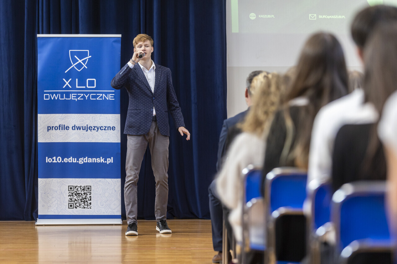 Gdańsk. Uroczyste ślubowanie pierwszych klas w X Liceum Ogólnokształcącym im. Lecha Bądkowskiego połączone z odsłonięciem muralu dydykowanego patronowi szkoły. W uroczystościach udział wzięli między innymi Emilia Lodzińska, Zastępczyni Prezydenta Miasta Gdańska ds. rozwoju przestrzennego i mieszkalnictwa, radni Andrzej Kowalczys i Wojciech Błaszkowski oraz Ryszard Muszytowski, Dyrektor Wydziału Edukacji w gdańskim magistracie. Gościem specjalnym była córka Lecha Bądkowskiego, Sławina Bądkowska-Kosmulska.