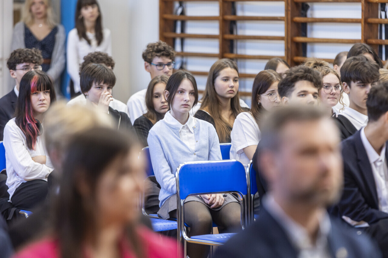 Gdańsk. Uroczyste ślubowanie pierwszych klas w X Liceum Ogólnokształcącym im. Lecha Bądkowskiego połączone z odsłonięciem muralu dydykowanego patronowi szkoły. W uroczystościach udział wzięli między innymi Emilia Lodzińska, Zastępczyni Prezydenta Miasta Gdańska ds. rozwoju przestrzennego i mieszkalnictwa, radni Andrzej Kowalczys i Wojciech Błaszkowski oraz Ryszard Muszytowski, Dyrektor Wydziału Edukacji w gdańskim magistracie. Gościem specjalnym była córka Lecha Bądkowskiego, Sławina Bądkowska-Kosmulska.