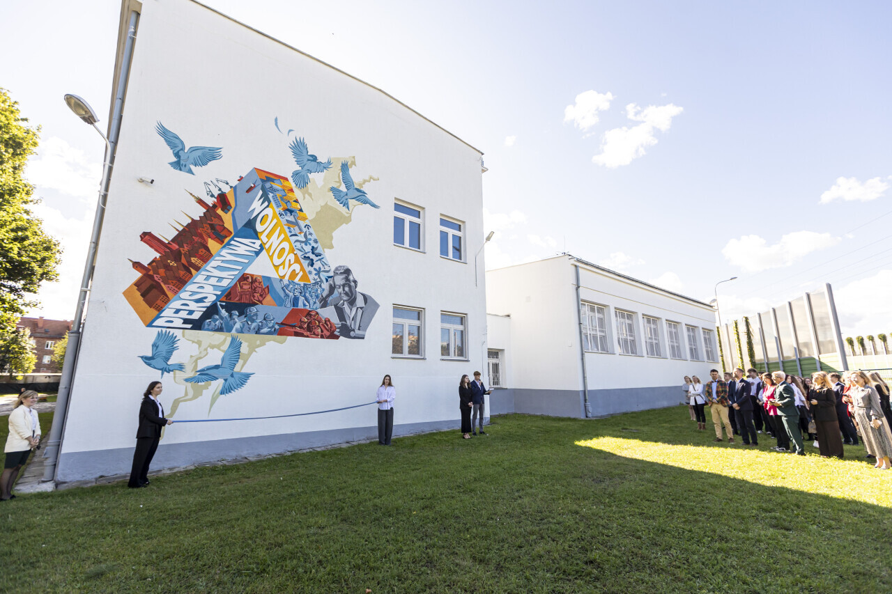 Gdańsk. Uroczyste ślubowanie pierwszych klas w X Liceum Ogólnokształcącym im. Lecha Bądkowskiego połączone z odsłonięciem muralu dydykowanego patronowi szkoły. W uroczystościach udział wzięli między innymi Emilia Lodzińska, Zastępczyni Prezydenta Miasta Gdańska ds. rozwoju przestrzennego i mieszkalnictwa, radni Andrzej Kowalczys i Wojciech Błaszkowski oraz Ryszard Muszytowski, Dyrektor Wydziału Edukacji w gdańskim magistracie. Gościem specjalnym była córka Lecha Bądkowskiego, Sławina Bądkowska-Kosmulska.