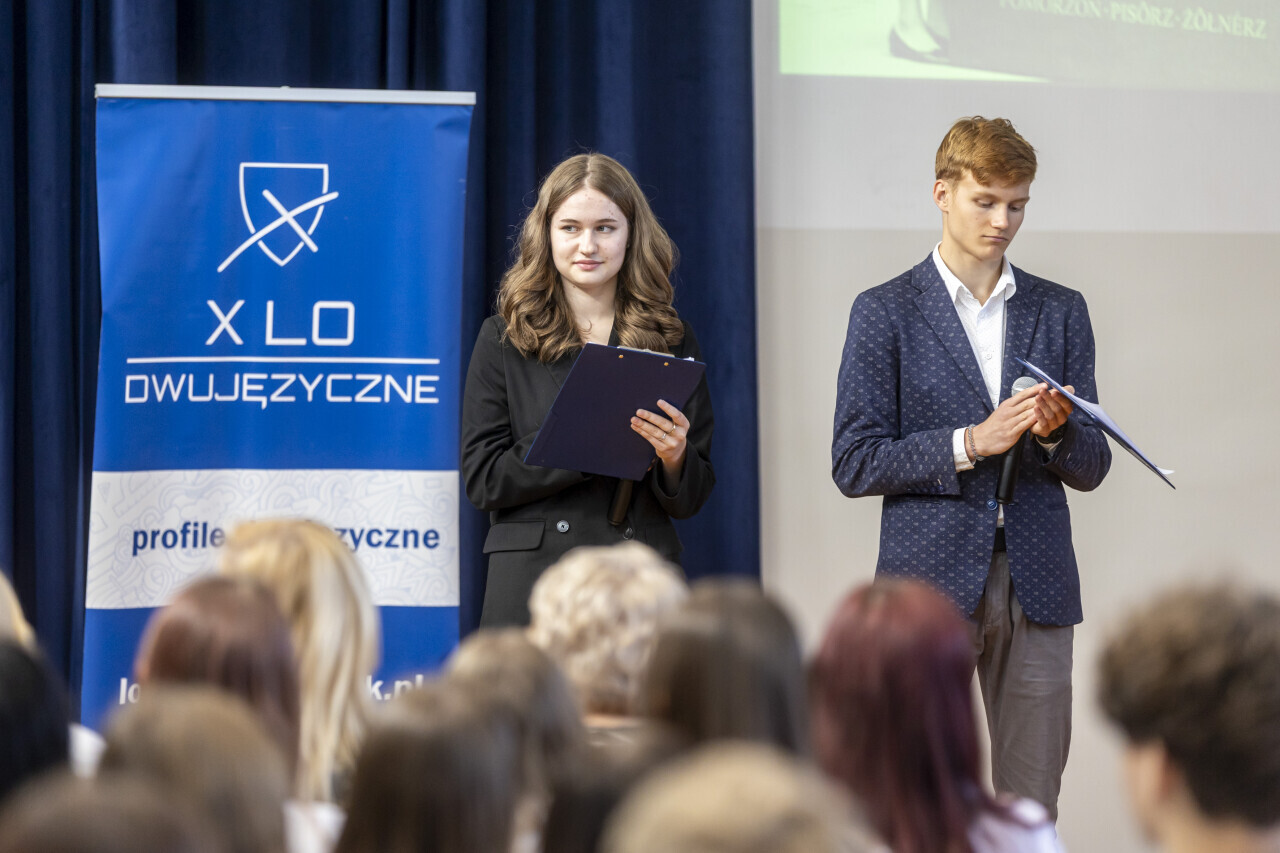 Gdańsk. Uroczyste ślubowanie pierwszych klas w X Liceum Ogólnokształcącym im. Lecha Bądkowskiego połączone z odsłonięciem muralu dydykowanego patronowi szkoły. W uroczystościach udział wzięli między innymi Emilia Lodzińska, Zastępczyni Prezydenta Miasta Gdańska ds. rozwoju przestrzennego i mieszkalnictwa, radni Andrzej Kowalczys i Wojciech Błaszkowski oraz Ryszard Muszytowski, Dyrektor Wydziału Edukacji w gdańskim magistracie. Gościem specjalnym była córka Lecha Bądkowskiego, Sławina Bądkowska-Kosmulska.