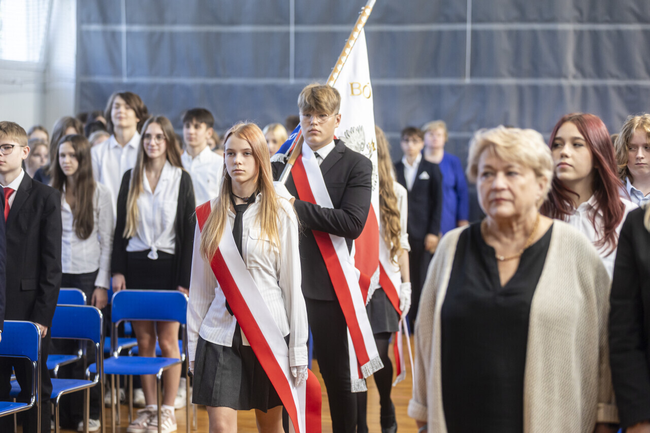 Gdańsk. Uroczyste ślubowanie pierwszych klas w X Liceum Ogólnokształcącym im. Lecha Bądkowskiego połączone z odsłonięciem muralu dydykowanego patronowi szkoły. W uroczystościach udział wzięli między innymi Emilia Lodzińska, Zastępczyni Prezydenta Miasta Gdańska ds. rozwoju przestrzennego i mieszkalnictwa, radni Andrzej Kowalczys i Wojciech Błaszkowski oraz Ryszard Muszytowski, Dyrektor Wydziału Edukacji w gdańskim magistracie. Gościem specjalnym była córka Lecha Bądkowskiego, Sławina Bądkowska-Kosmulska.
