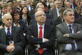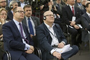 Międzynarodowy kongres "Smart Metropolia" poświęcony rozwojowi miast i obszarów metropolitalnych. Sesja plenarna. Gdańsk, Amber Expo. Nz. od lewej: prof. Tadeusz Markowski i prof. Mario Raich