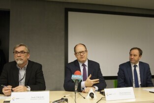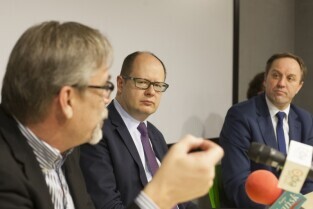 Konferencja prasowa poświęcona Międzynarodowemu Kongresowi "Smart Metropolia". Gdańsk, Amber Expo. Nz. od lewej: Jacek Żakowski, Prezydent Gdańska Paweł Adamowicz, Marszałek Woj. Pomorskiego Mieczysław Struk