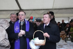 Gdańsk, Targ Węglowy. Wielkanocne śniadanie dla ubogich i bezdomnych zorganizowane przez gdańskich restauratorów. Nz. (od prawej) Radny Miasta Gdańska Piotr Dzik, ks. Infułat Stanisław Bogdanowicz i Andrzej Szydłowski.