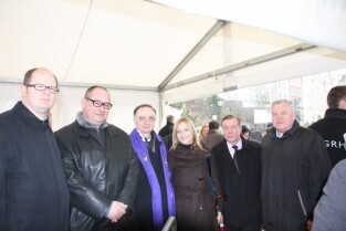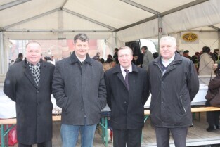 Gdańsk, Targ Węglowy. Wielkanocne śniadanie dla ubogich i bezdomnych zorganizowane przez gdańskich restauratorów. Nz. (od lewej) Prezydent Gdańska Paweł Adamowicz, Radny Grzegorz Strzelczyk, ks. Infułat Stanisław Bogdanowicz, poseł na Sejm RP Iwona Guzowska, Radny Piotr Dzik, Andrzej Szydłowski.