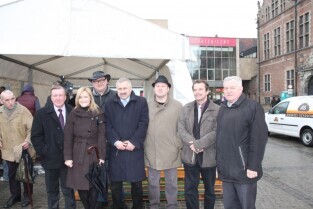 Gdańsk, Targ Węglowy. Wielkanocne śniadanie dla ubogich i bezdomnych zorganizowane przez gdańskich restauratorów. Nz. (od lewej) Radny Piotr Dzik, poseł na Sejm RP Iwona Guzowska, Radny Grzegorz Strzelczyk, Radny Jacek Włodzimierz Teodorczyk, Radny Wiesław Kamiński, Radny Jarosław Gorecki, Andrzej Szydłowski.