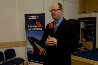 Solidarni ze Stocznią - konferencja prasowa poświęcona programowi pomocy zwalnianym stoczniowcom. Gdańsk, Centralne Muzeum Morskie. Nz. Prezydent Gdańska Paweł Adamowicz