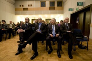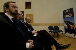 Solidarni ze Stoczni - konferencja prasowa powicona programowi pomocy zwalnianym stoczniowcom. Gdask, Centralne Muzeum Morskie. Nz. od lewej: Dyrektor Powiatowego Urzdu Pracy w Gdasku Roland Budnik, Prezydent Gdaska Pawe Adamowicz, Prezes spki DGA Andrzej Gowacki, W-ce Marszaek Wojewdztwa Pomorskiego Wiesaw Byczkowski