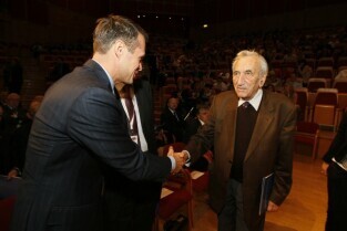 Konferencja "Solidarność dla przyszłości - Europa i świat 30 lat po zwycięstwie polskiej Solidarności". Gdańsk, Filharmonia Bałtycka. Nz. były Prezydent RP Lech Wałęsa i Minister Kancelarii Prezydenta RP Sławomir Nowak