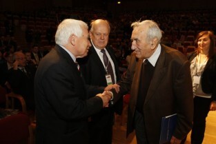 Konferencja "Solidarność dla przyszłości - Europa i świat 30 lat po zwycięstwie polskiej Solidarności". Gdańsk, Filharmonia Bałtycka. Nz. były Premier RP Tadeusz Mazowiecki i były Prezydent RP Lech Wałęsa