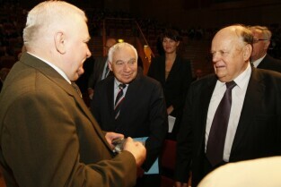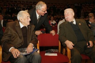 Konferencja "Solidarność dla przyszłości - Europa i świat 30 lat po zwycięstwie polskiej Solidarności". Gdańsk, Filharmonia Bałtycka. Nz. od lewej: były Prezydent RP Lech Wałęsa, były Prezydent Bułgarii Żeliu Żelew i były prezes Rady Najwyższej Białorusi Stanisław Szuszkiewicz