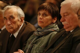 Konferencja "Solidarność dla przyszłości - Europa i świat 30 lat po zwycięstwie polskiej Solidarności". Gdańsk, Filharmonia Bałtycka. Nz. od lewej: były Premier RP Tadeusz Mazowiecki, Janina Ochojska i były Prezydent RP Lech Wałęsa