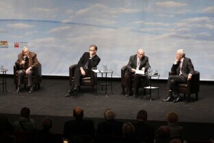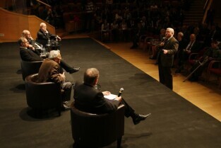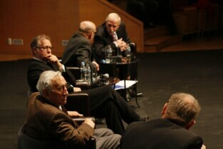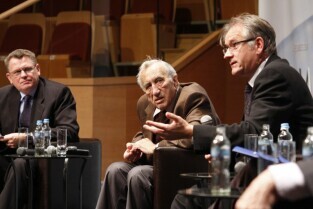 Konferencja "Solidarność dla przyszłości - Europa i świat 30 lat po zwycięstwie polskiej Solidarności". Gdańsk, Filharmonia Bałtycka. Nz. debata, w której udział wzięli: prof. Edmund Wnuk-Lipiński, prof. Paweł Śpiewak, prof. Jan Zielonka, były Premier RP Tadeusz Mazowiecki oraz były Prezydent RP Lech Wałęsa