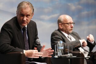 Konferencja "Solidarność dla przyszłości - Europa i świat 30 lat po zwycięstwie polskiej Solidarności". Gdańsk, Filharmonia Bałtycka. Nz. od prawej: prof. Paweł Śpiewak, prof. Jan Zielonka.
