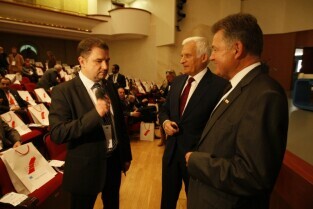 Konferencja Solidarność narodów, demokracja i wolność mediów XXI wieku, w której uczestniczyli działacze i dziennikarze z krajów Afryki północnej objętych rewolucją. Gdańsk, Akademia Muzyczna. Nz. od lewej: Przewodniczący NSZZ Solidarność Piotr Duda, Przewodniczący Parlamentu Europejskiego Jerzy Buzek, były Przewodniczący NSZZ Solidarność Marian Krzaklewski