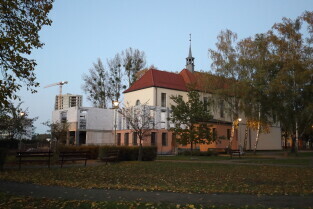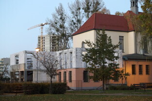 Gdańsk. Spacer w dzielnicy Letnica z Prezydent Gdańska Aleksandrą Dulkiewicz. Nz. Budowa żłobka i przedszkola przy kościele parafialnym pw.św. Anny i Joachima.