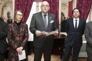 Gdańsk, Dom Uphagena. Spotkanie noworoczne Korpusu Konsularnego Trójmiasta oraz pomorskich samorządowców. Nz. od lewej: Konsul Honorowy Królestwa Niderlandów Magdalena Pramfelt, Senator RP Edmund Wittbrodt, Marszałek Senatu RP Bogdan Borusewicz
