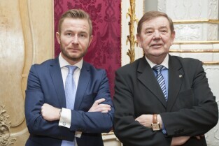 Gdańsk, Dom Uphagena. Spotkanie noworoczne Korpusu Konsularnego Trójmiasta oraz pomorskich samorządowców. Nz. Marszałek Woj. Pomorskiego Mieczysław Struk (po lewej) i Prezydent Słupska Maciej Kobyliński