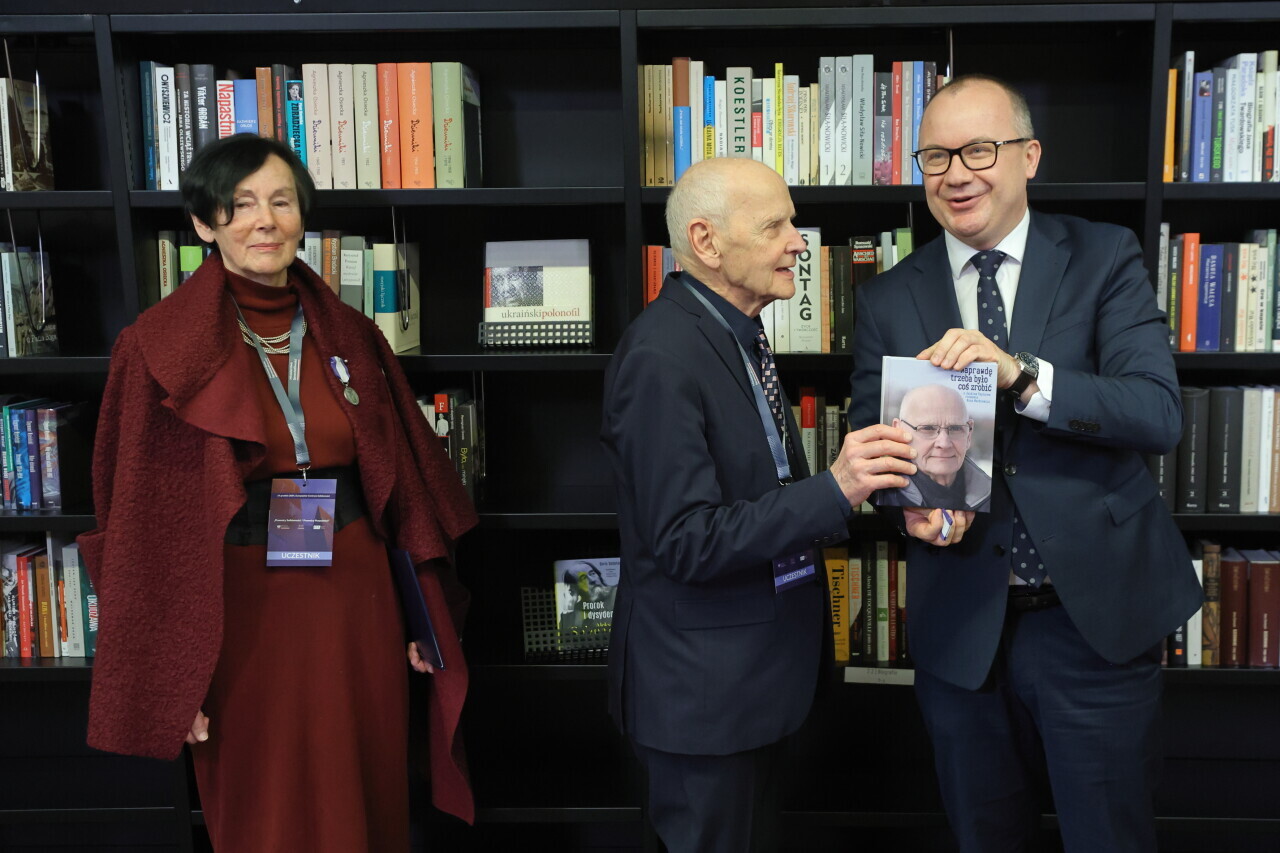 Gdańsk. Spotkanie Ministra Sprawiedliwości Adama Bodnara ze środowiskiem prawniczym Wybrzeża - Prawnicy Solidarności / Prawnicy Przyszłości. Wręczenie odznaczeń Zasłużony dla Wymiaru Sprawiedliwości adw. Romanie Orlikowskiej-Wrońskiej i adw. Jackowi Taylorowi. Nz. adw. Romana Orlikowska Wrońska, adw. Jacek Tayllor i minister Adam Bodnar.