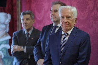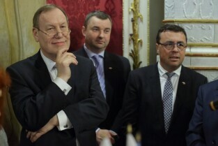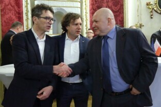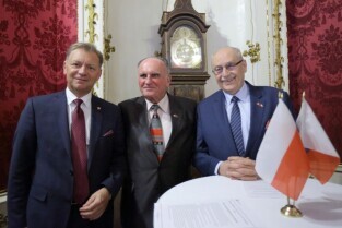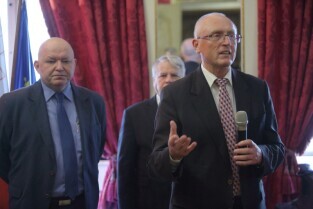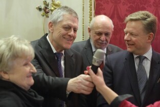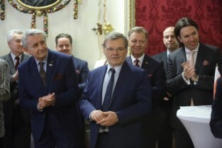 Gdańsk. Dom Uphagena. Oddział Muzeum Historycznego Miasta Gdańska. Spotkanie Noworoczne z Honorowymi Konsulami. Nz. Wiesław Byczkowski-Wicemarszałek Województwa Pomorskiego, Prezydent Sopotu Jacek Karnowski i Marszałek Senatu Bogdan Borusewicz.