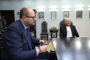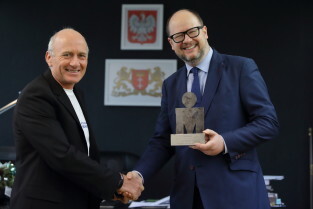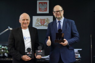 Spotkanie Prezydent Gdańska Pawła Adamowicza z Dariuszem Drapellą, który zajął drugie miejsce na triathlonowych zawodach "Ironman Argentina"