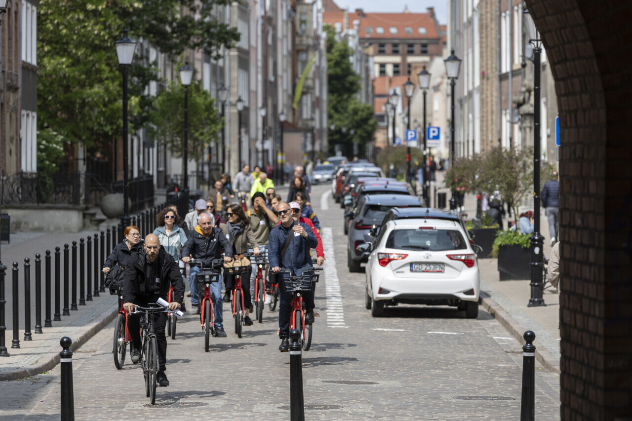 Gdańsk.Spotkanie Sieci Miast i Regionów Europejskiej Federacji Cyklistów. Nz. Przejazd techniczny ulicami Głównego Miasta.