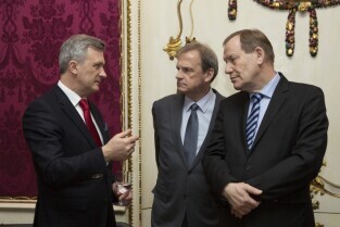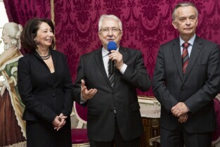 Spotkanie noworoczne Stowarzyszenia Konsulów Honorowych. Gdańsk, Dom Uphagena, ul. Długa. Nz. od lewej: Konsul Honorowa Królestwa Niderlandów Magdalena Pramfelt, Senator RP Edmund Wittbrodt, Rektor Uniwersytetu Gdańskiego prof. Bernard Lammek