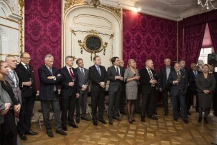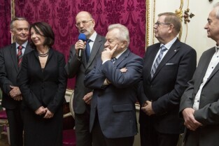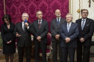 Spotkanie noworoczne Stowarzyszenia Konsulów Honorowych. Gdańsk, Dom Uphagena, ul. Długa. Nz. od lewej: Konsul Honorowa Królestwa Niderlandów Magdalena Pramfelt, Senator RP Edmund Wittbrodt, Rektor Uniwersytetu Gdańskiego prof. Bernard Lammek, Rektor Politechniki Gdańskiej prof. Henryk Krawczyk , Prezes Gdańskiego Klubu Biznesu Jan Zerębski, Prezes Gdańskich Inwestycji Komunalnych Ryszard Trykosko