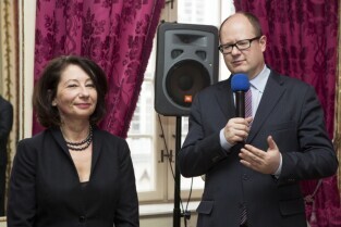 Spotkanie noworoczne Stowarzyszenia Konsulów Honorowych. Gdańsk, Dom Uphagena, ul. Długa. Nz. Konsul Honorowa Królestwa Niderlandów Magdalena Pramfelt i Prezydent Gdańska Paweł Adamowicz