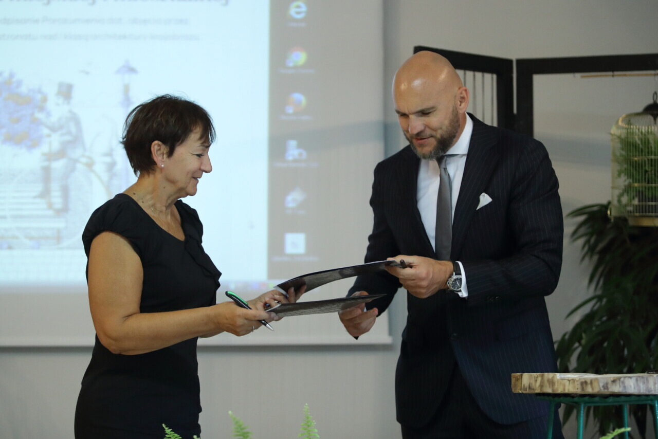 Gdańsk, Zespół Szkół Architektury Krajobrazu i Handlowo - Usługowych. Spotkanie „Znaczenie zieleni w przestrzeni miejskiej" dotyczące objęcia patronatem klasy I technikum architektury krajobrazu przez firmę Moderna Holding. Nz. Dyrektor. Jadwiga Chys i Adam Małaczek, prezes zarządu Moderna Holding.