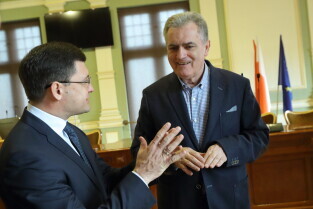 Gdańsk. Spotkanie delegacji z Mariupola z władzami Gdańska. Nz. Mer Mariupola Vadym Boichenko i Przewodniczący Rady Miasta Bogdan Oleszek.