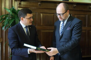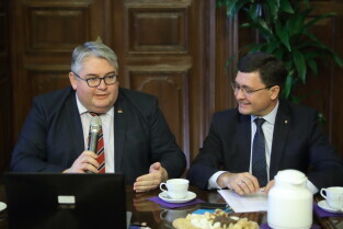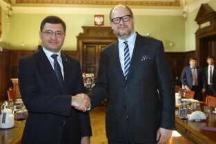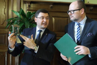 Gdańsk. Spotkanie delegacji z Mariupola z władzami Gdańska. Nz. Wiceprezydent Gdańska Piotr Kowalczuk i Mer Mariupola Vadym Boichenko.