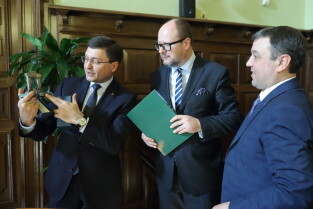 Gdańsk. Spotkanie delegacji z Mariupola z władzami Gdańska. Nz. Wiceprezydent Gdańska Piotr Kowalczuk, Wiceprezydent Gdańska Wiesław Bielawski i Mer Mariupola Vadym Boichenko.