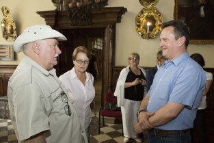 Spotkanie gości IV Światowego Zjazdu Gdańszczan z byłym Prezydentem RP Lechem Wałęsą i Prezydentem Gdańska Pawłem Adamowiczem. Gdańsk, Dwór Artusa