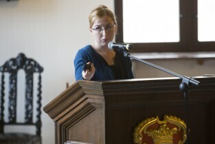 Gdańsk, Ratusz Głównego Miasta. Spotkanie poświęcone Rewaloryzacji Drogi Królewskiej w Gdańsku. Nz. Katarzyna Piotrowska (Muzeum Historyczne Miasta Gdańska)