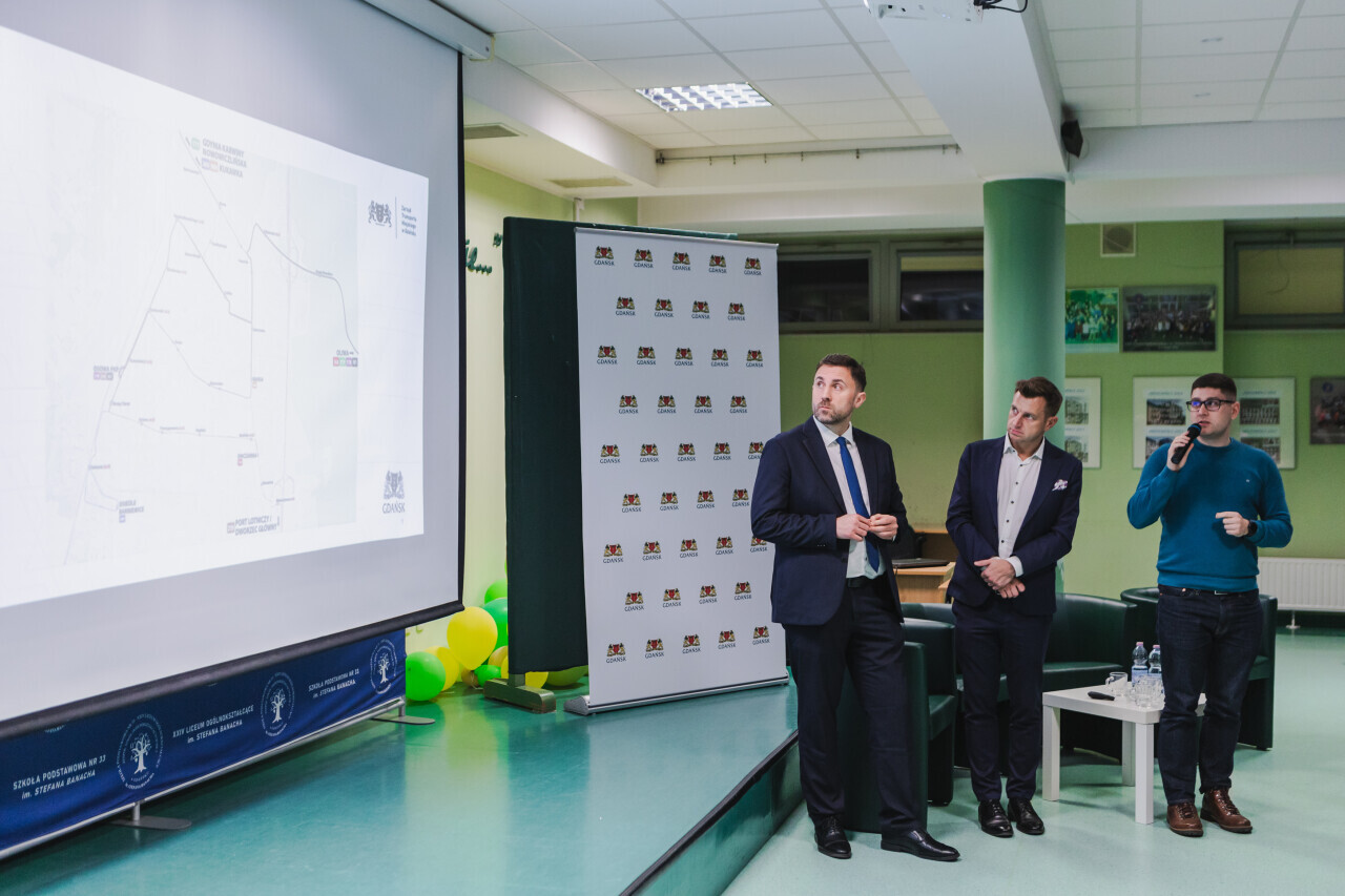 Gdańsk, ZSO nr 2 ul. Wodnika. Spotkanie o komunikacji publicznej w Osowej. Z mieszkańcami dzielnicy spotkał się Piotr Borawski, zastępca prezydent Gdańska ds. mobilności i bezpieczeństwa oraz przedstawiciele Zarządu Transportu Miejskiego, na czele z dyrektorem ZTM Łukaszem Kłosem.