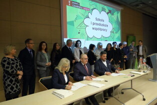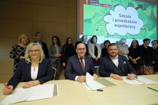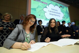 Gdańsk. Spotkanie plenarne z dyrektorami gdańskich szkół i placówek oświatowych. Nz. Podpisanie umowy o współpracy między dyrektorami szkół a MTG.