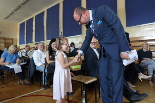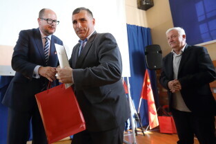 Gdańsk. Twoja dzielnica - Twój Gdańsk. Spotkanie prezydenta z mieszkańcami dzielnicy Strzyża. Nz. Prezydent Gdańska Paweł Adamowicz wręczył wyróżnienie Dariuszowi Majorek.