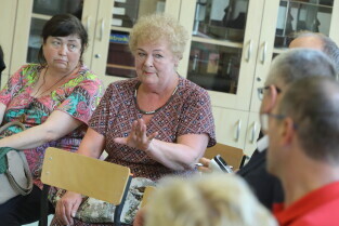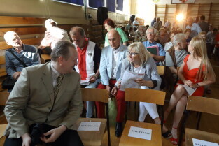 Gdańsk. Twoja dzielnica - Twój Gdańsk. Spotkanie prezydenta z mieszkańcami dzielnicy Strzyża. Nz. Prezydent Gdańska Paweł Adamowicz wręczył wyróżnienie Marii Bernolak-Szczypior.