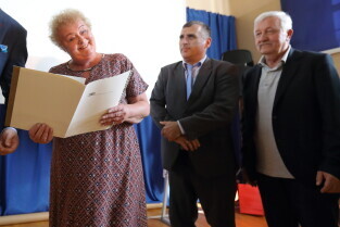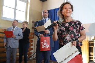 Gdańsk. Twoja dzielnica - Twój Gdańsk. Spotkanie prezydenta z mieszkańcami dzielnicy Strzyża. Nz. Prezydent Gdańska Paweł Adamowicz wręczył wyróżnienie Marii Prokopowicz.