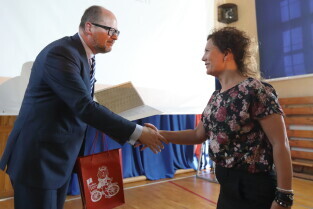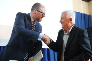 Gdańsk. Twoja dzielnica - Twój Gdańsk. Spotkanie prezydenta z mieszkańcami dzielnicy Strzyża. Nz. Prezydent Gdańska Paweł Adamowicz wręczył wyróżnienie Piotrowi Osiecimskiemu.