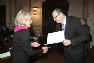 Spotkanie Społecznego Komitetu Wsparcia EURO 2012 i Pomorskiego Komitetu Organizacyjnego EURO 2012. Gdańsk, Nowy Ratusz. Nz. Andrzej Czyżewski otrzymuje powołanie na członka SKWE 2012