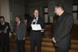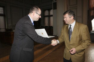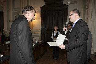 Spotkanie Społecznego Komitetu Wsparcia EURO 2012 i Pomorskiego Komitetu Organizacyjnego EURO 2012. Gdańsk, Nowy Ratusz. Nz. Andrzej Kowalik otrzymuje powołanie na członka SKWE 2012