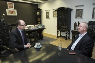 Spotkanie Prezydenta Gdańska Pawła Adamowicza z Konsulem Generalnym RP we Lwowie Jarosławem Drozdem. Gdańsk, Urząd Miejski