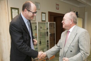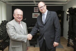 Spotkanie Prezydenta Gdańska Pawła Adamowicza z nowomianowanym Konsulem Federacji Rosyjskiej w Gdańsku Alexandrem Karachevtsevem (po prawej)