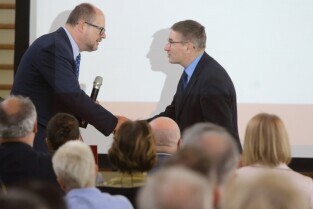 Gdańsk. Spotkanie Obywatelskie Prezydenta Gdańska z cyklu "Twoja Dzielnica Twój Gdańsk" z Mieszkańcami Dzielnicy Olszynka. Nz. Prezydent Gdańska Paweł Adamowicz i Pastor Marian Biernacki-Centrum Chrześcijańskie Nowe Życie.